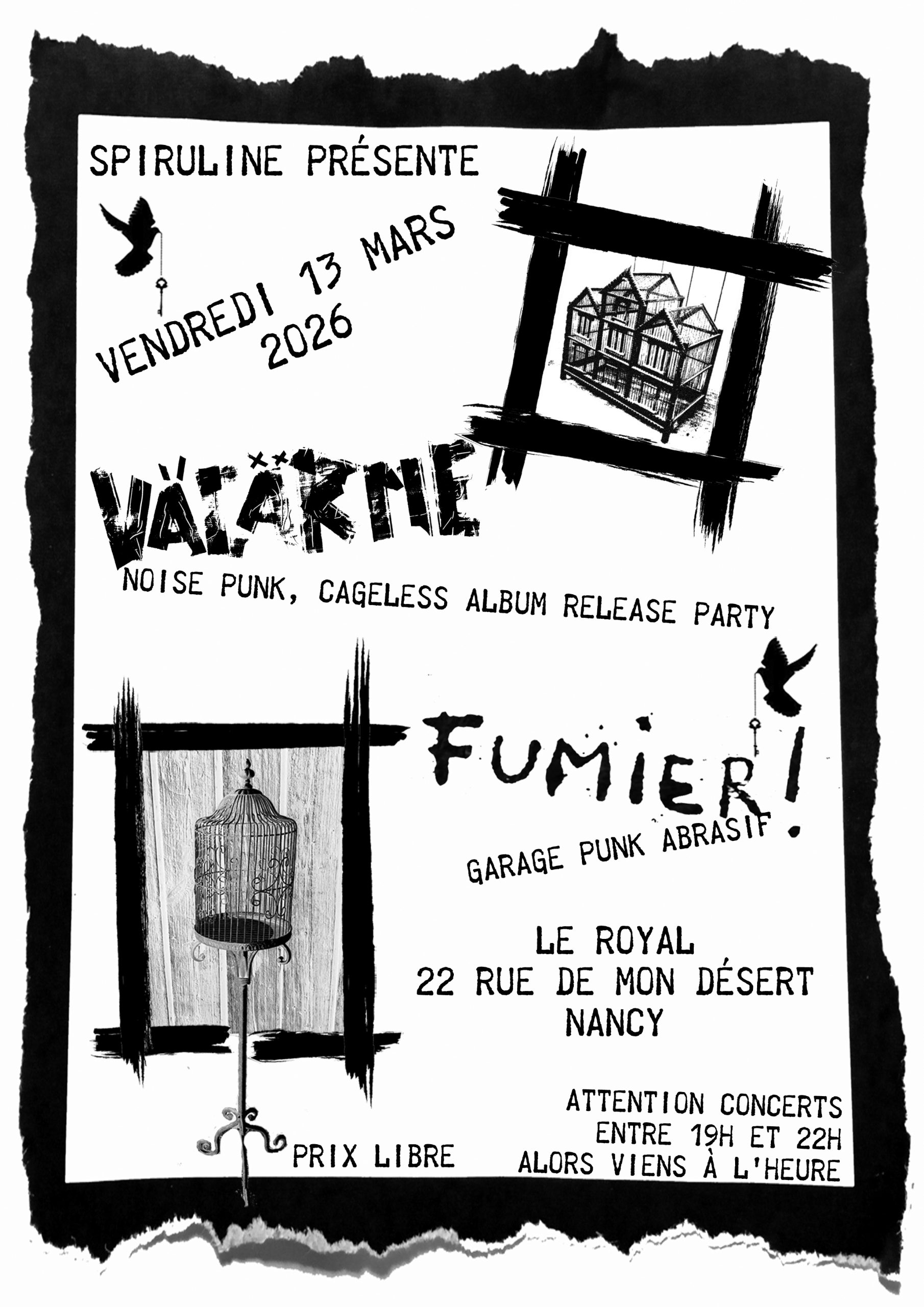 Nous avions du reporter la release party de l’album de Väcärme ( noise punk spiru familly) , suite à la fermeture du Daisy Club fin décembre. Nous sommes heureux de vous annoncer, qu’elle aura lieu avec le même line up de soirée, le 13 mars prochain au Bar Le Royal.